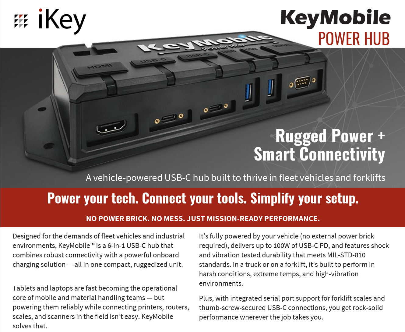 The KeyMobile Power Hub is a rugged 6-in-1 USB-C hub built for fleet vehicles, forklifts, and public safety. Delivering up to 100W power delivery with MIL-STD-810 durability, it keeps laptops, tablets, and devices connected and powered in the toughest environments.